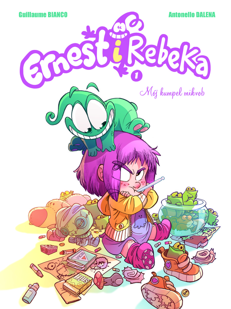Rebeka ma sześć lat, prawie sześć i pół. Choruje częściej niż inne dzieci, bo ma słaby system odpornościowy. Jakby tego było mało, jej rodzice coraz częściej się kłócą i myślą o rozwodzie. Wtedy w życiu dziewczynki pojawia się niesamowity przyjaciel – mikrob Ernest! Zaczyna szkolić Rebekę w sztuce mikrobii, dzięki której łatwiej będzie jej pokonywać codzienne kłopoty. A kiedy bohaterka wyjedzie na wieś do szalonego Dziadka Owadka, przypomni sobie, jak wygląda szczęśliwe życie... Ernest i Rebeka to chwilami wesoła, chwilami smutna, ale zawsze mądra opowieść, która zdobyła nagrodę Festiwalu Komiksowego w Angouleme w 2013 roku.